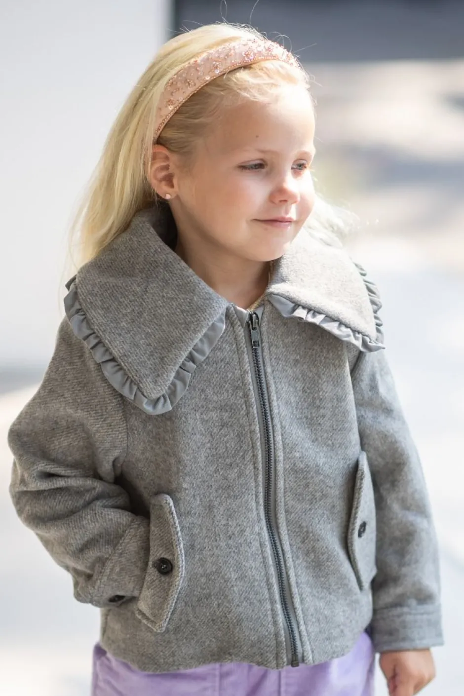 Dit stijlvolle, grijze jacket van Baje Studio is zowel modieus als praktisch. Het jasje is gemaakt van een mix van wol en polyester en daarmee heerlijk warm. De opvallende kraag met subtiele ruffles geven een speels effect. Daarnaast heeft de jas een stevige ritssluiting en twee zakken. De binnenkant is mega aaibaar dankzij haar fluffy-teddy stof. Een kwalitatief mooi jacket wat je gemakkelijk combineert bij allerlei outfits!