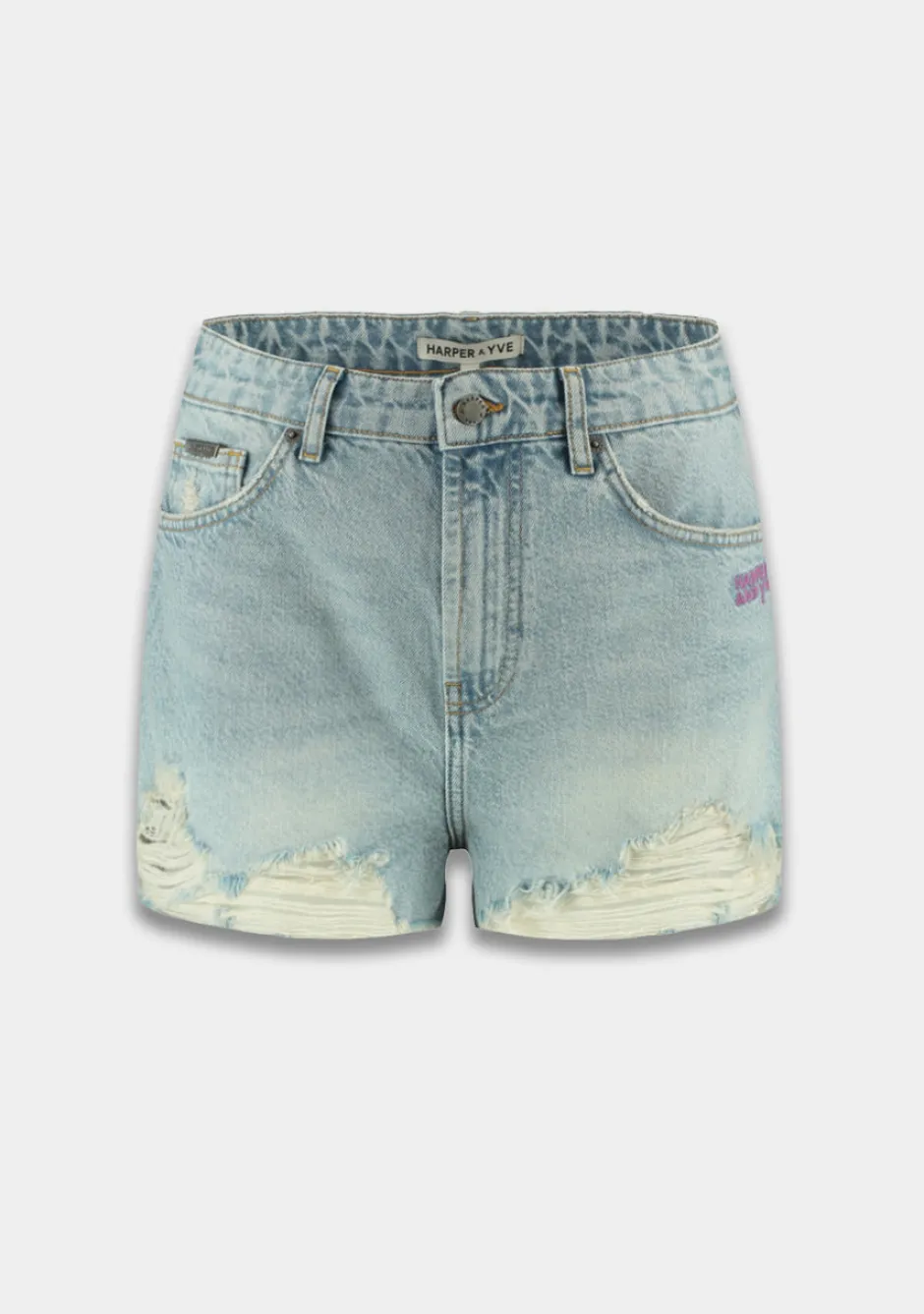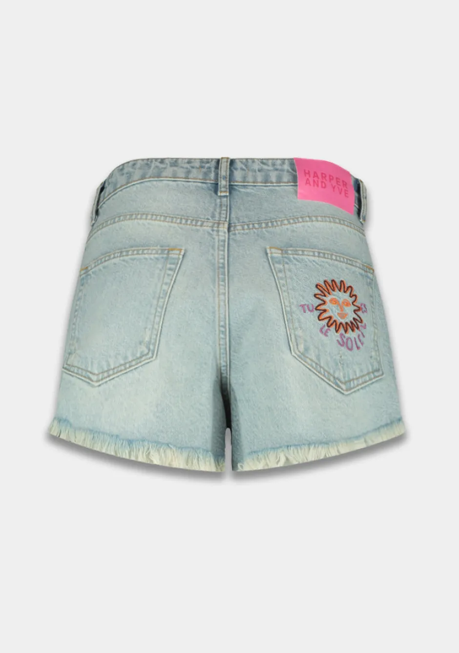 Shortje met gerafelde onderkant en geborduurde details Combineer het shortje met het bijpassende jack…