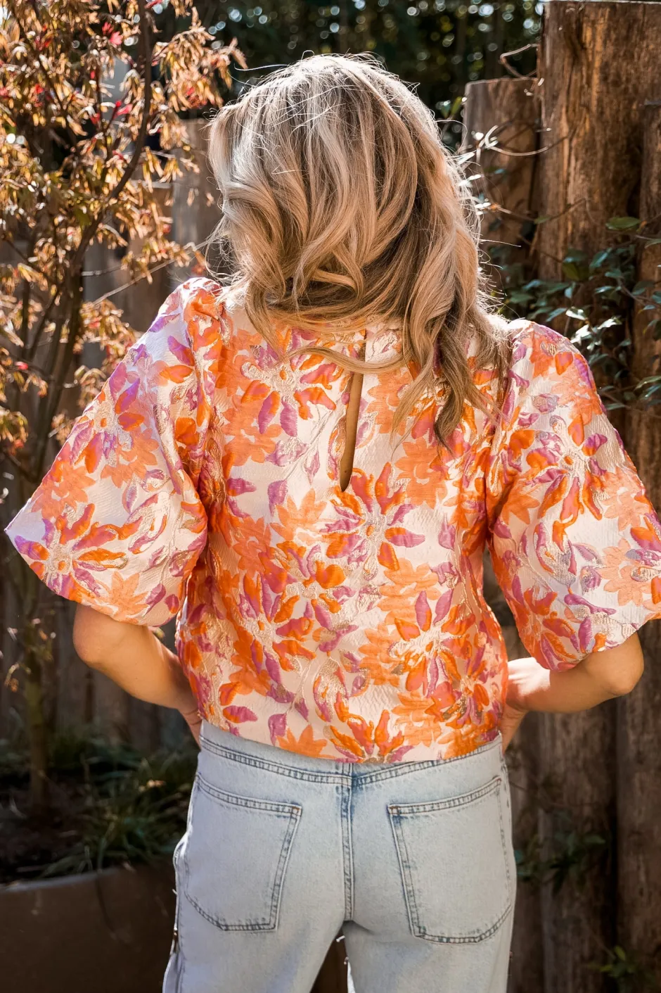 De top heeft een bloemenprint met een chique glans