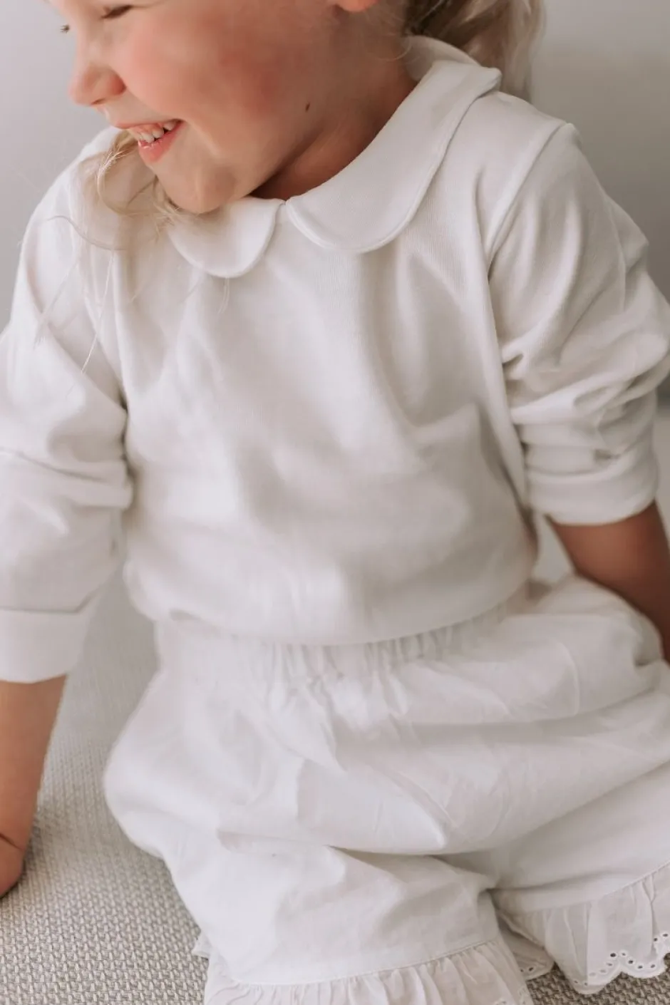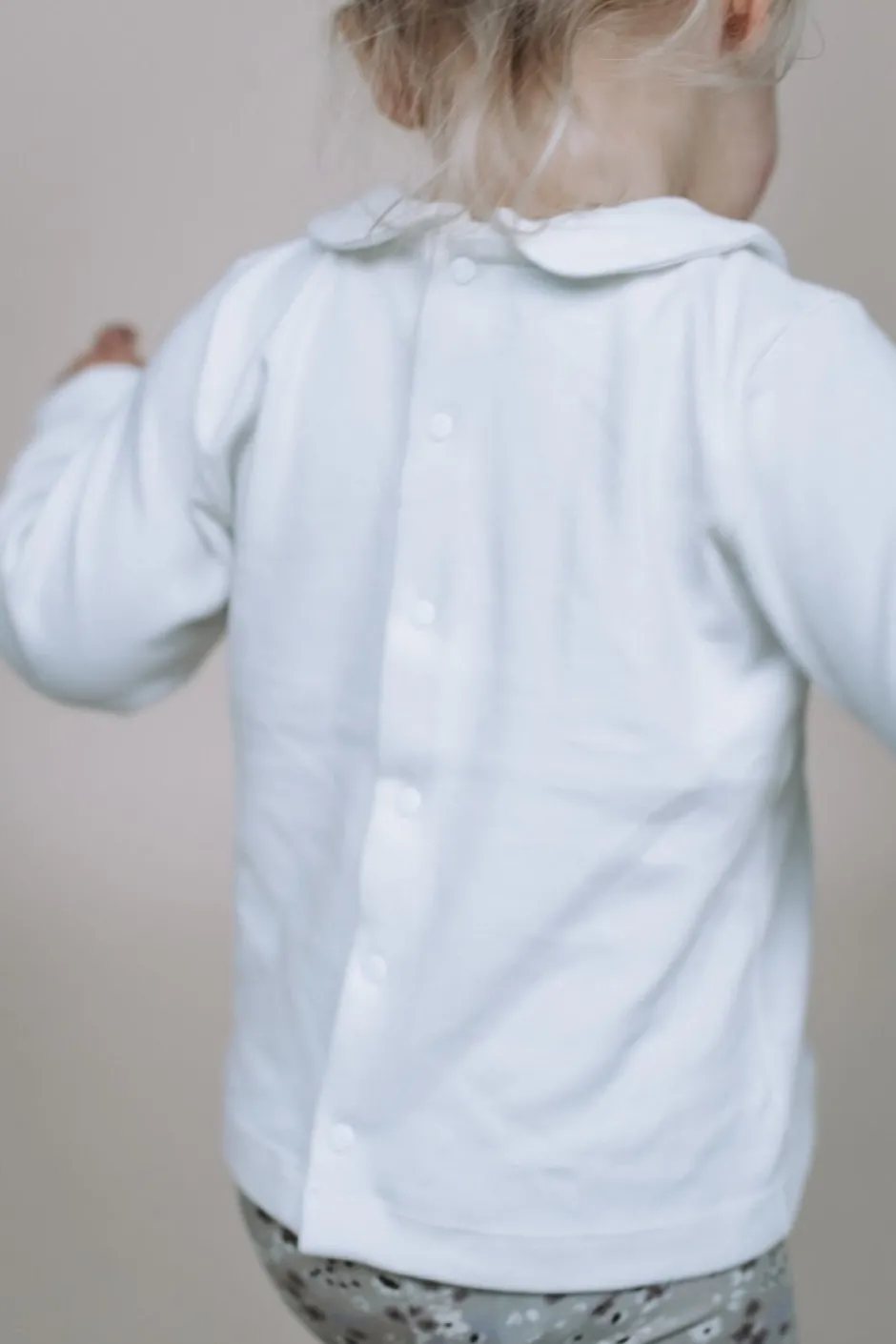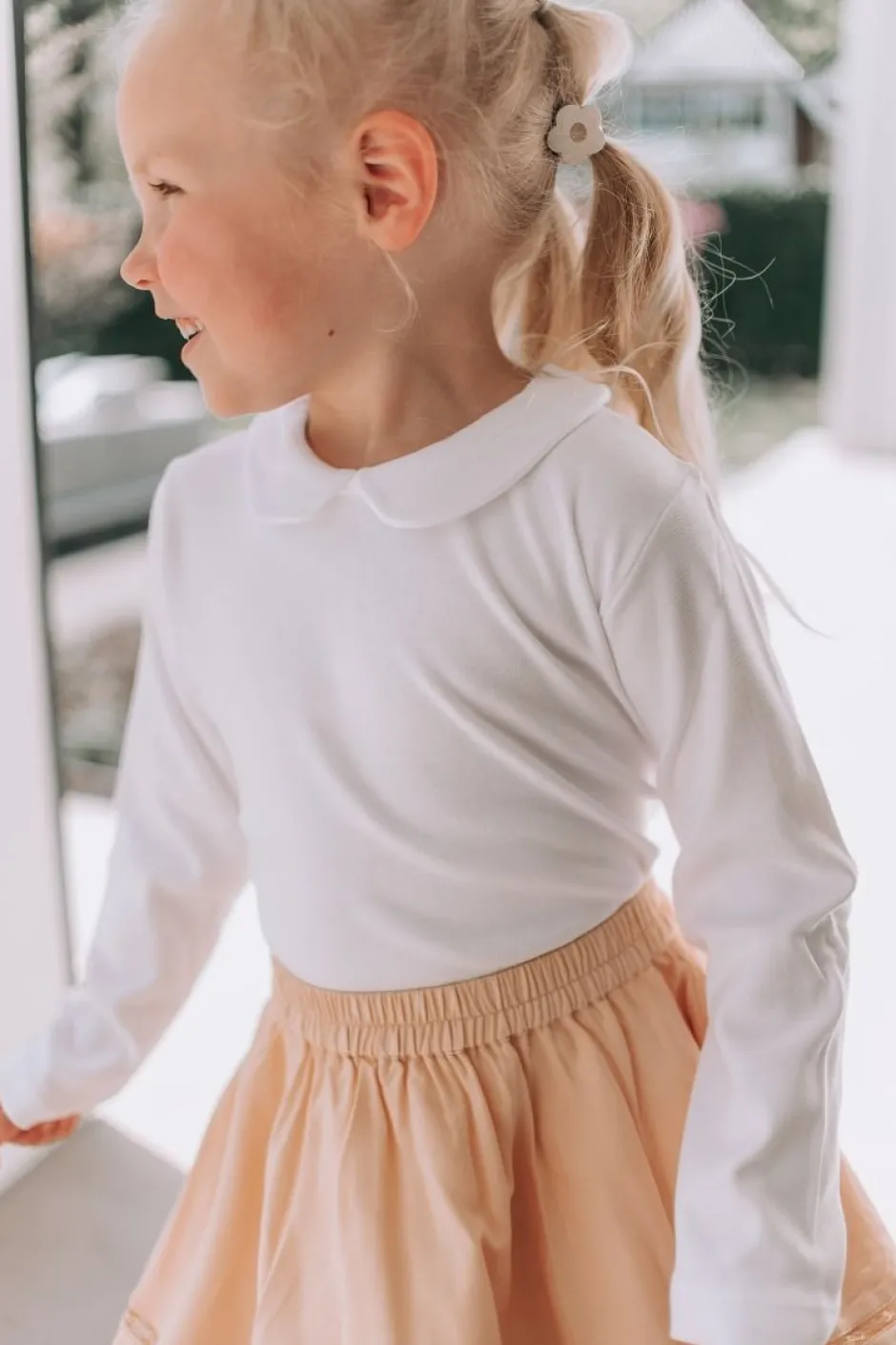 Dit zachte effen shirtje met een klassiek Peter Pan kraagje is op meerdere manieren te stylen! Draag het shirt bij een toffe flared broek en je hebt gelijk een hippe outfit, of draag het onder een lekkere dikke trui met een rokje en de outfit oogt ineens klassiek! Door het zachte katoen is het shirtje zowel prettig te dragen onder een trui (of tuinbroek) of los als item. Geschikt voor elk seizoen.