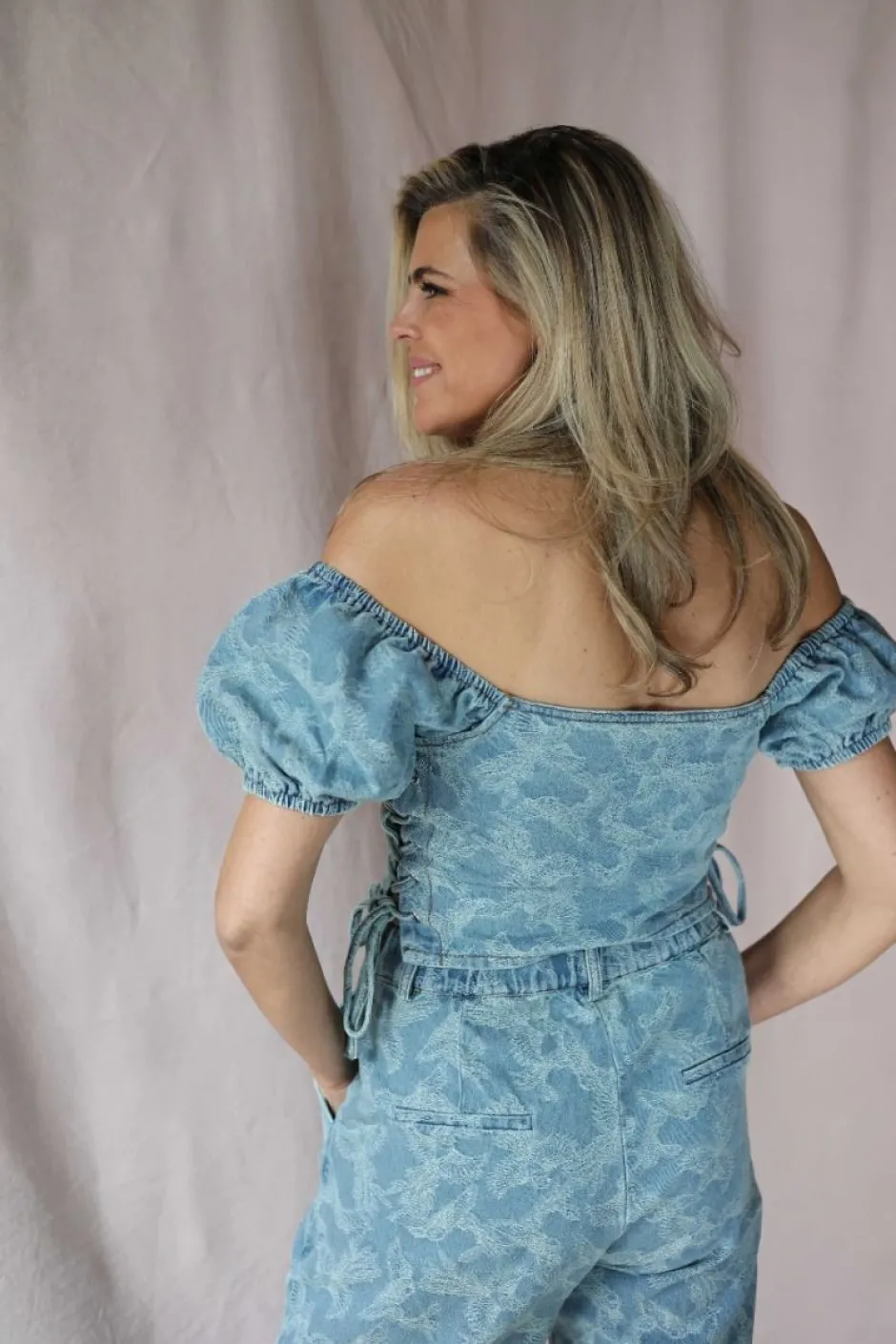 Deze denim top heeft een all-over print, pofmouwen en schattige strikjes aan de zijkanten Combineer de top met de bijpassende broek en blazer!