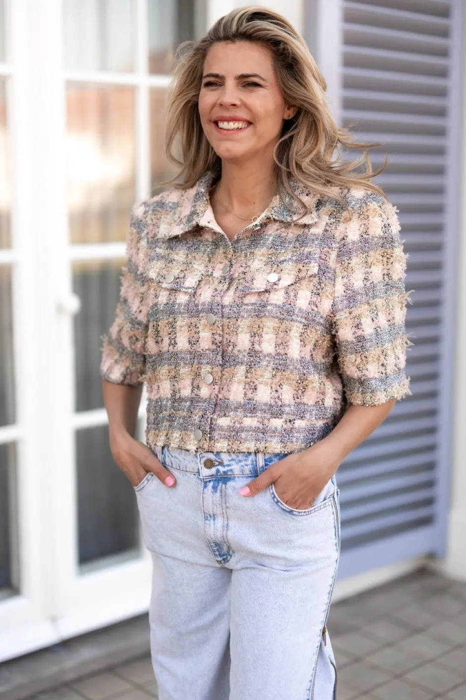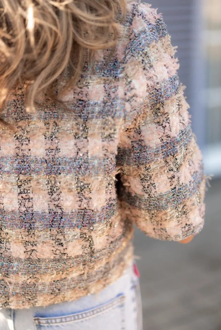 鈾é achtige stof met een geblokte print en een lurexdraadje鈾