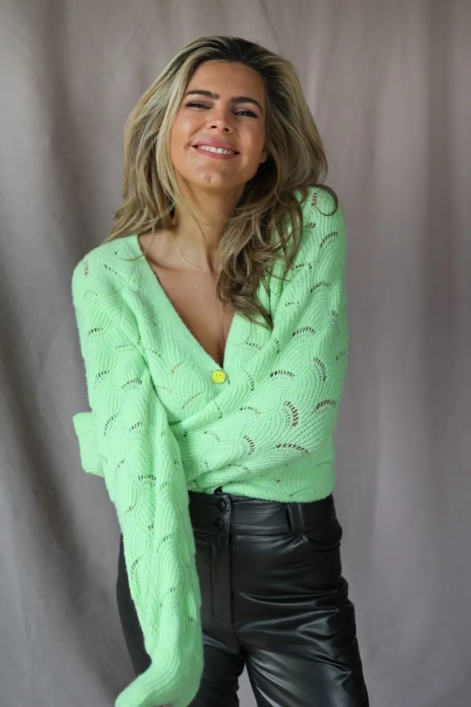 Combineer de cardigan met broek Anna-Mae zoals Kim