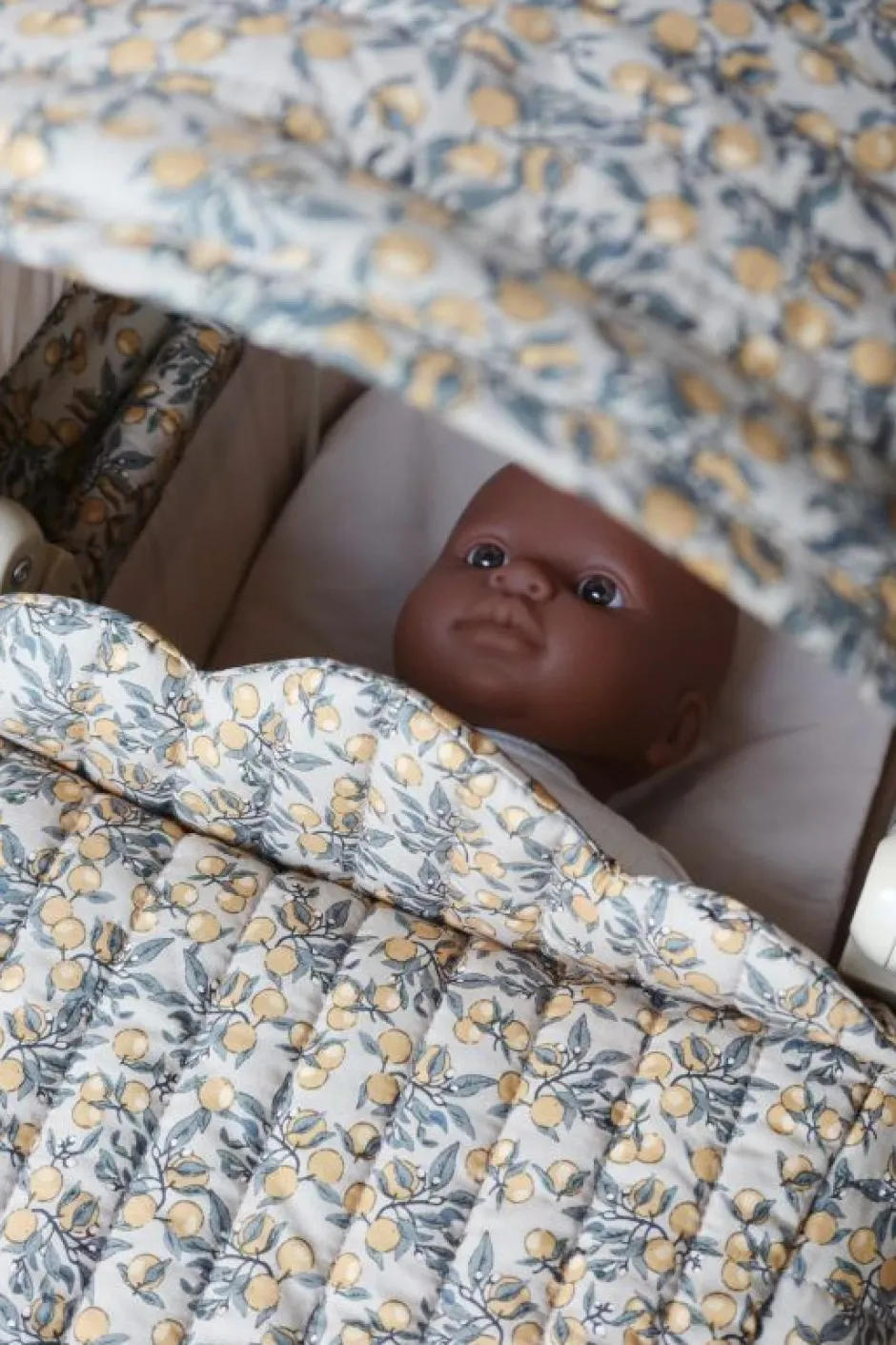 Deze super toffe vintage poppenwagen met citroenprint is echt zo leuk! De wagen heeft grote wielen en is voorzien van gewatteerde bedrukte stof. Ook heeft hij een zacht opbergmandje onder de wagen waar jouw kleintje al zijn spulletjes voor de pop in kwijt kan. Zo kan jouw kindje ook gezellig samen met mama wandelen, hoe leuk is dat?