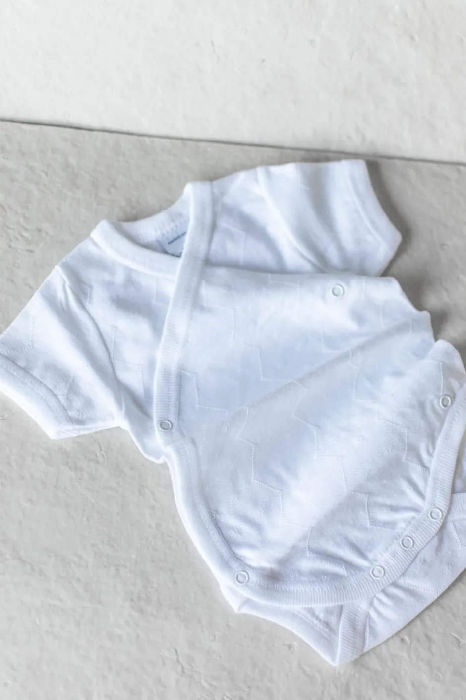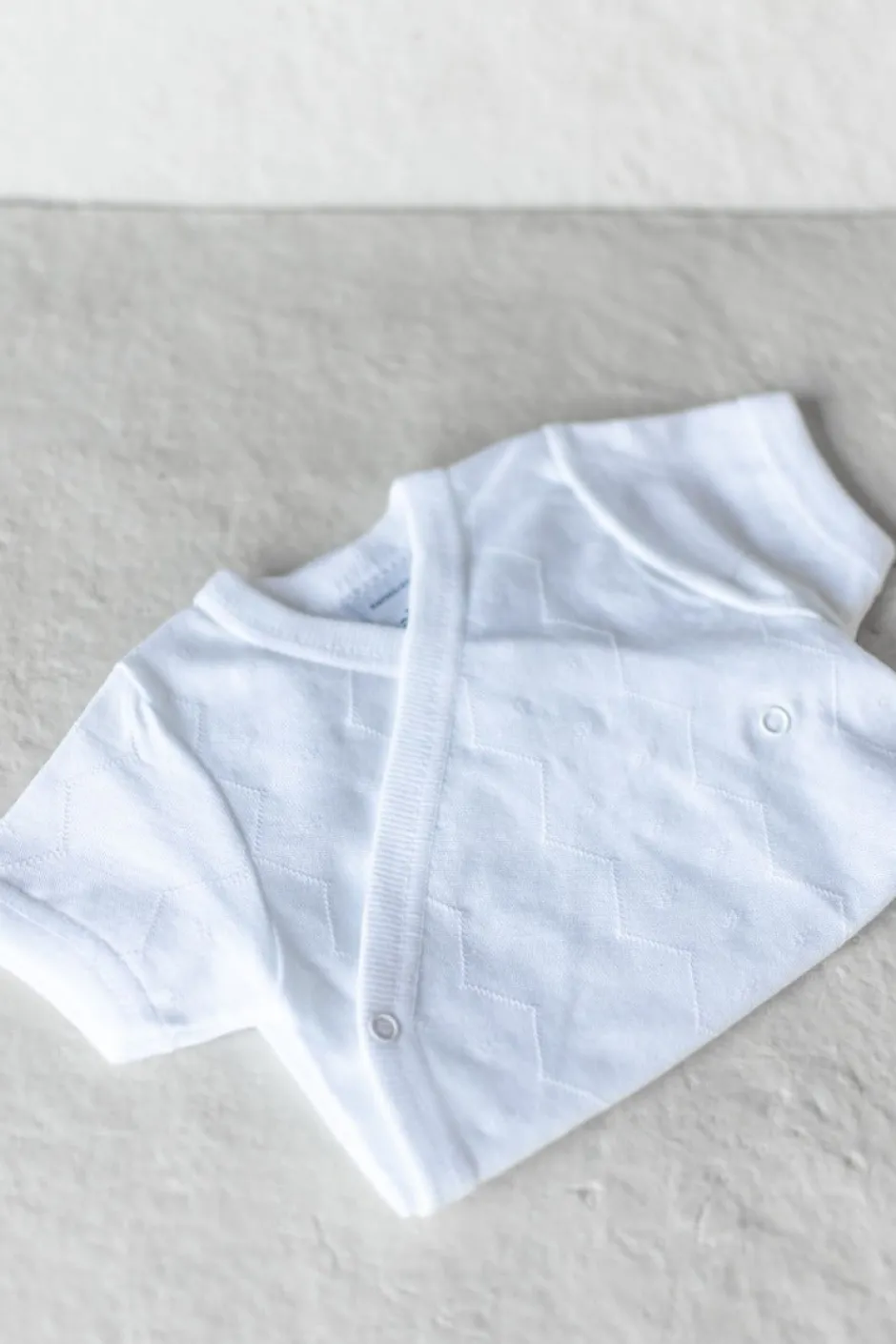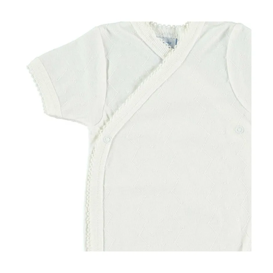 Kort mouwen rompertje met een mooi ‘werkje’ erin. De romper is verkrijgbaar in het wit en off-white.