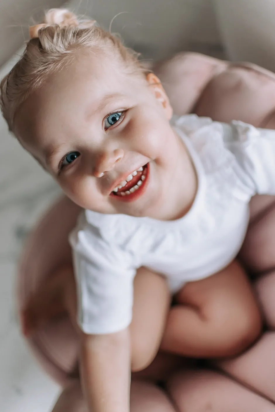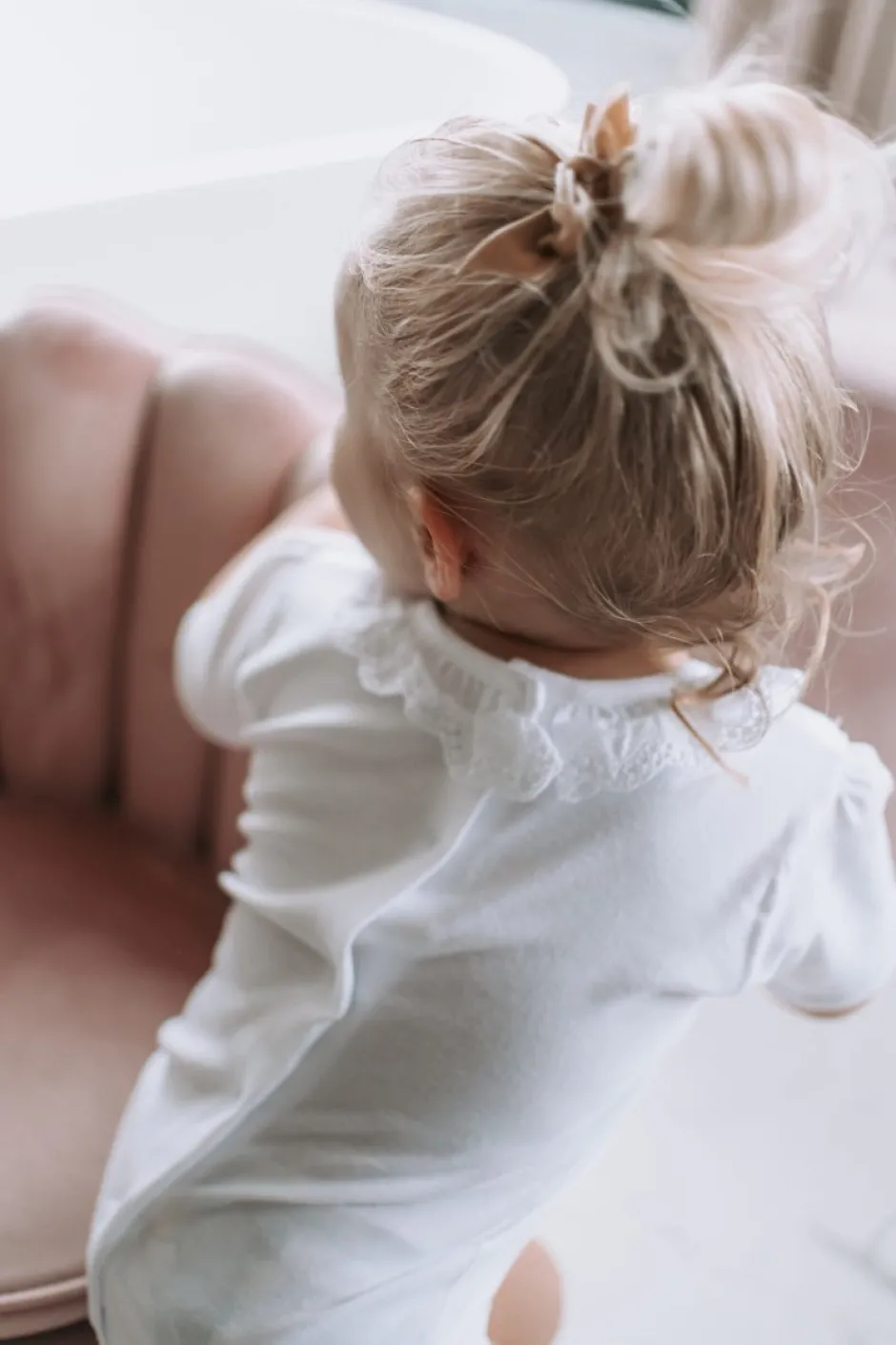 Elli (2 jaar) draagt hier het rompertje 1 maat groter (36 maanden). Het rompertje valt klein.