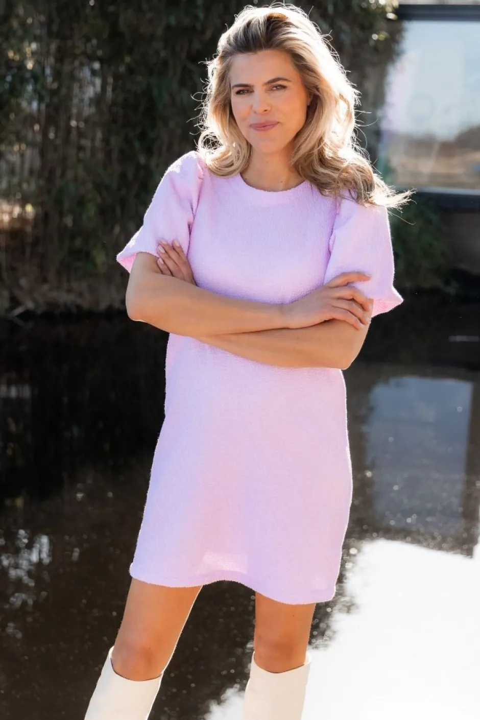 Wauw! Deze jurk van Bô-Dôme is de perfecte mix van elegantie en speelse charme. Deze jurk, met haar subtiele textuur en zachte lila tint, is ideaal voor elke gelegenheid. Of je nu een speciale gelegenheid hebt of gewoon je dag wilt opfleuren, deze jurk zorgt ervoor dat jij in de spotlight staat. Maak de look compleet door de jurk te combineren met stoere laarzen en een jasje, en je bent helemaal klaar om de dag te rocken.