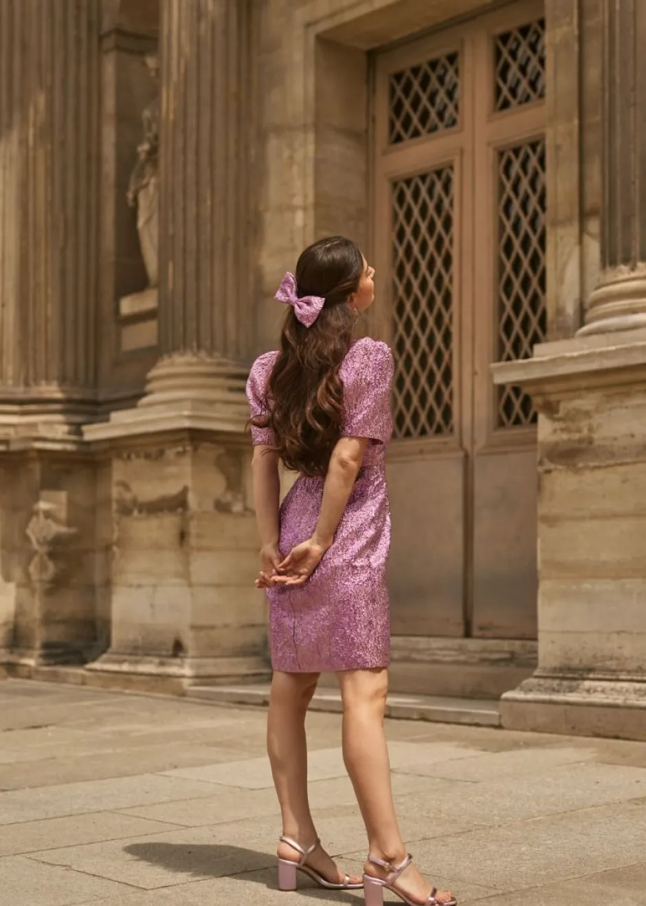 Deze prachtige roze jurk heeft pofmouwen en een V-hals