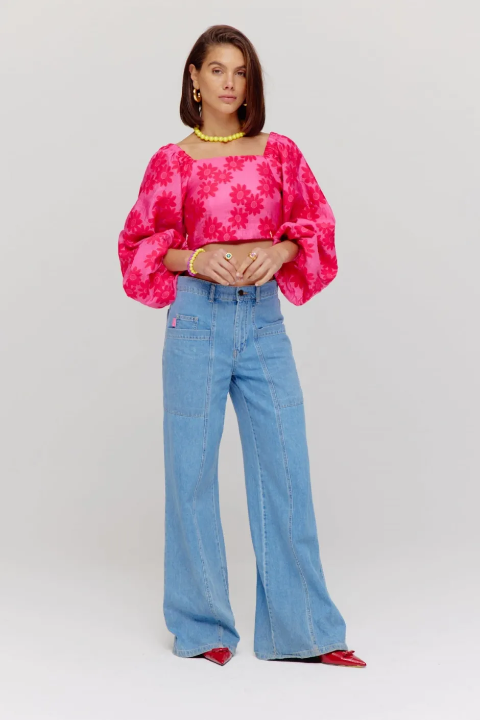 馃┓ Deze prachtige roze top heeft een all-over bloemenprint, lange pofmouwen en een kort model