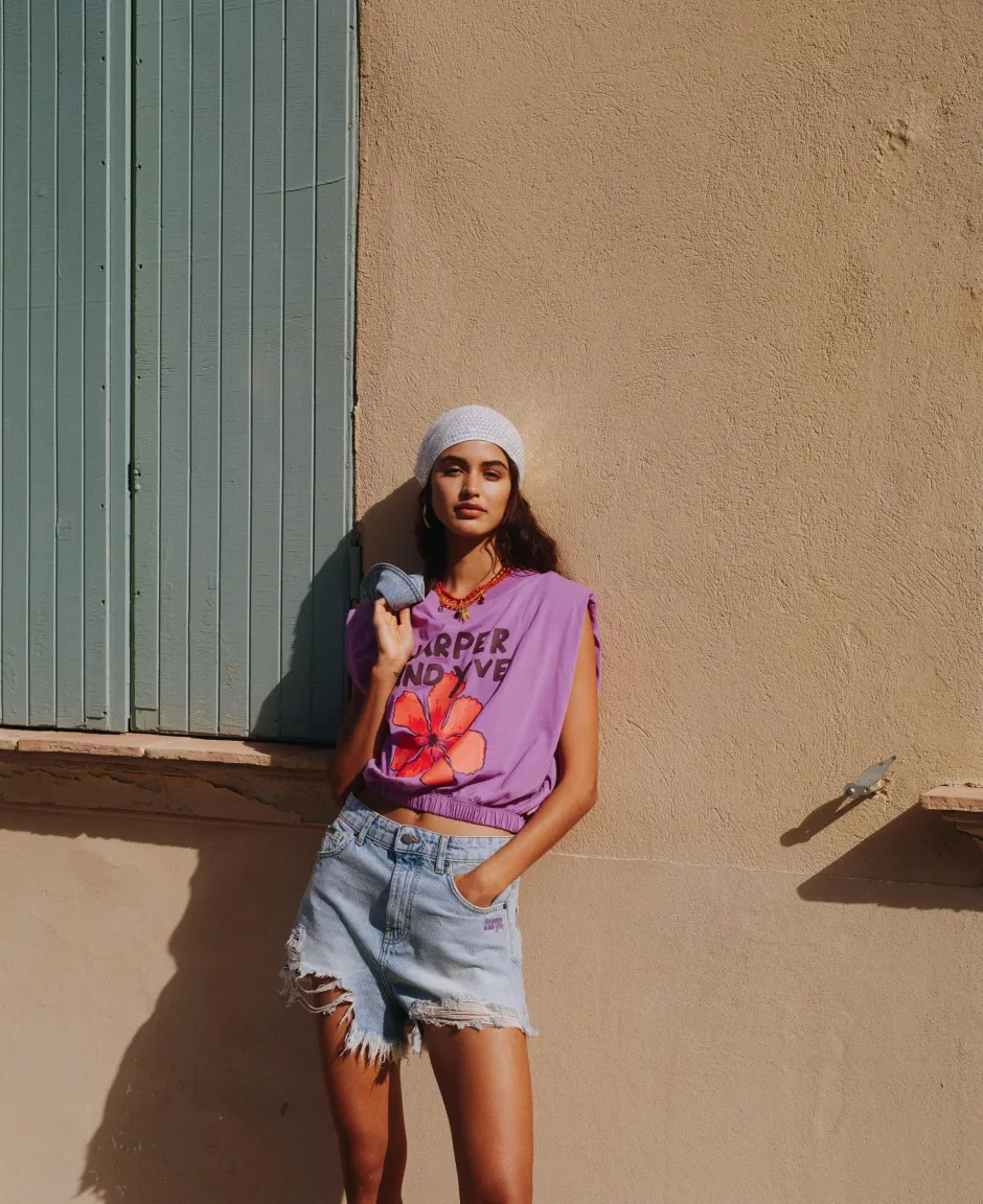Shortje met gerafelde onderkant en geborduurde details Combineer het shortje met het bijpassende jack…
