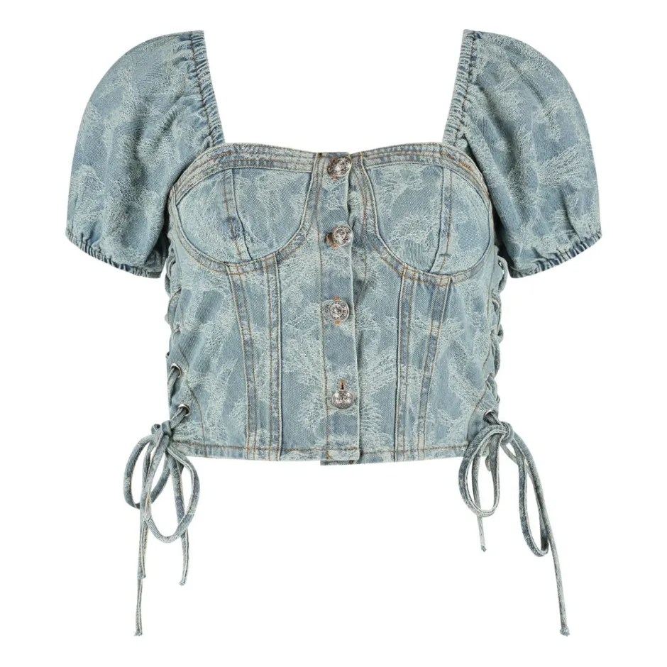 Deze denim top heeft een all-over print, pofmouwen en schattige strikjes aan de zijkanten Combineer de top met de bijpassende broek en blazer!
