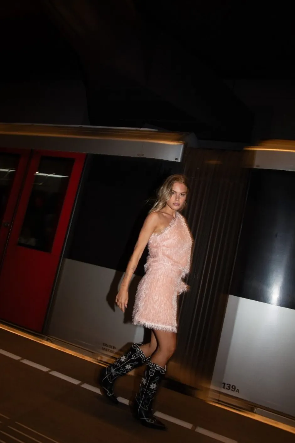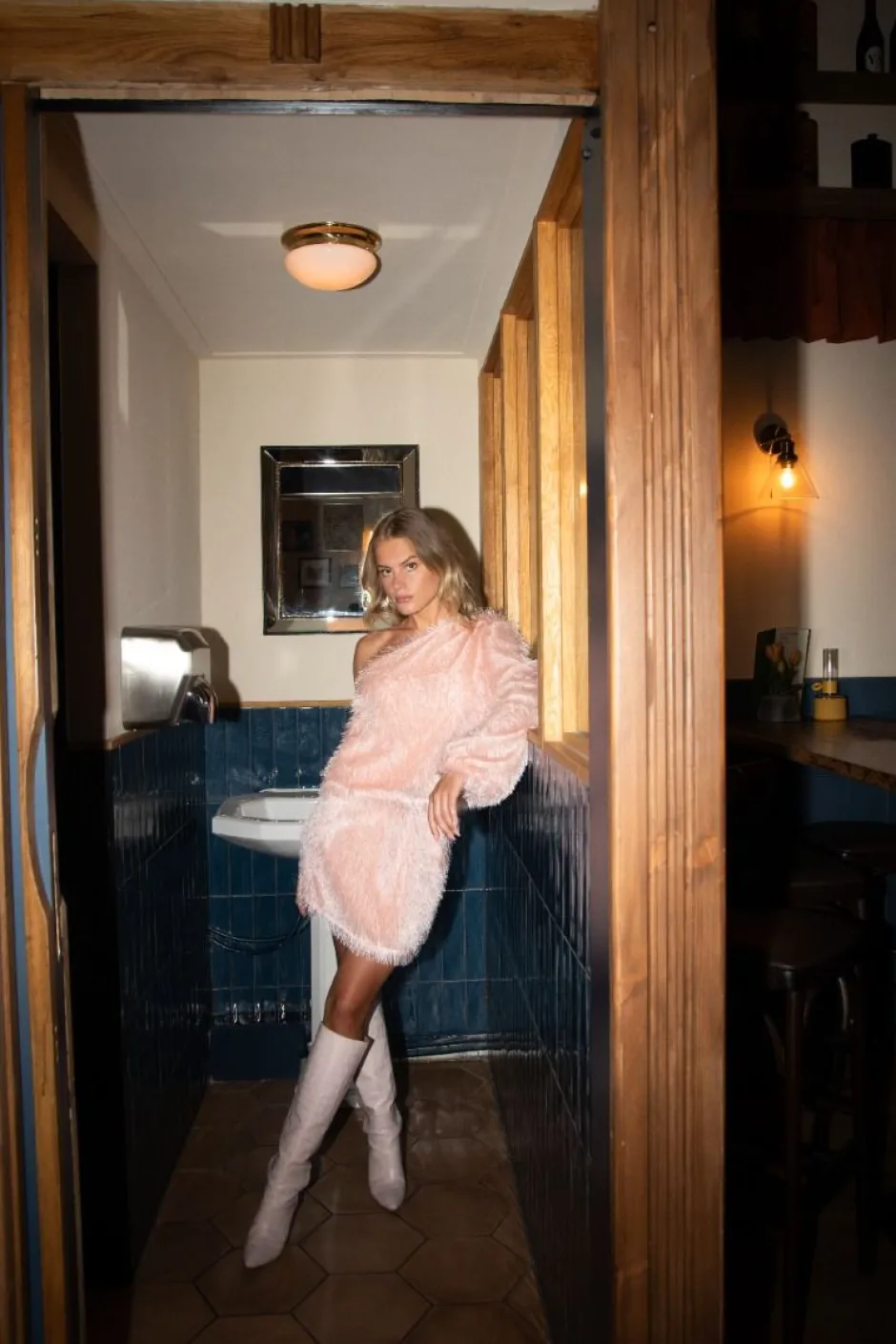 Lichtroze, zachte one-shoulder top met feather look Draag de top zoals Kim met broek Jill of juist met een stoere jeans