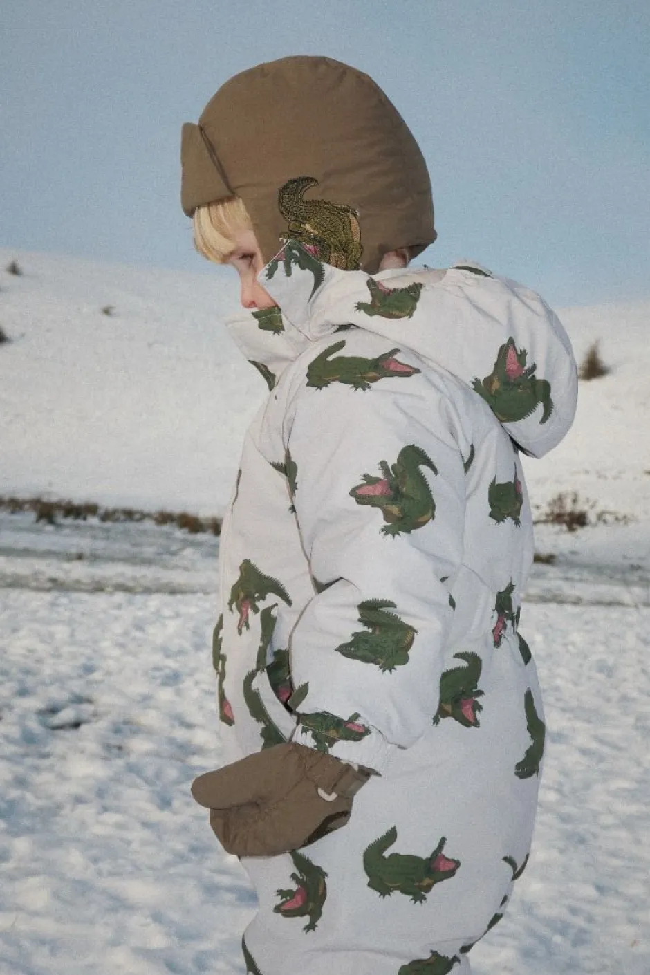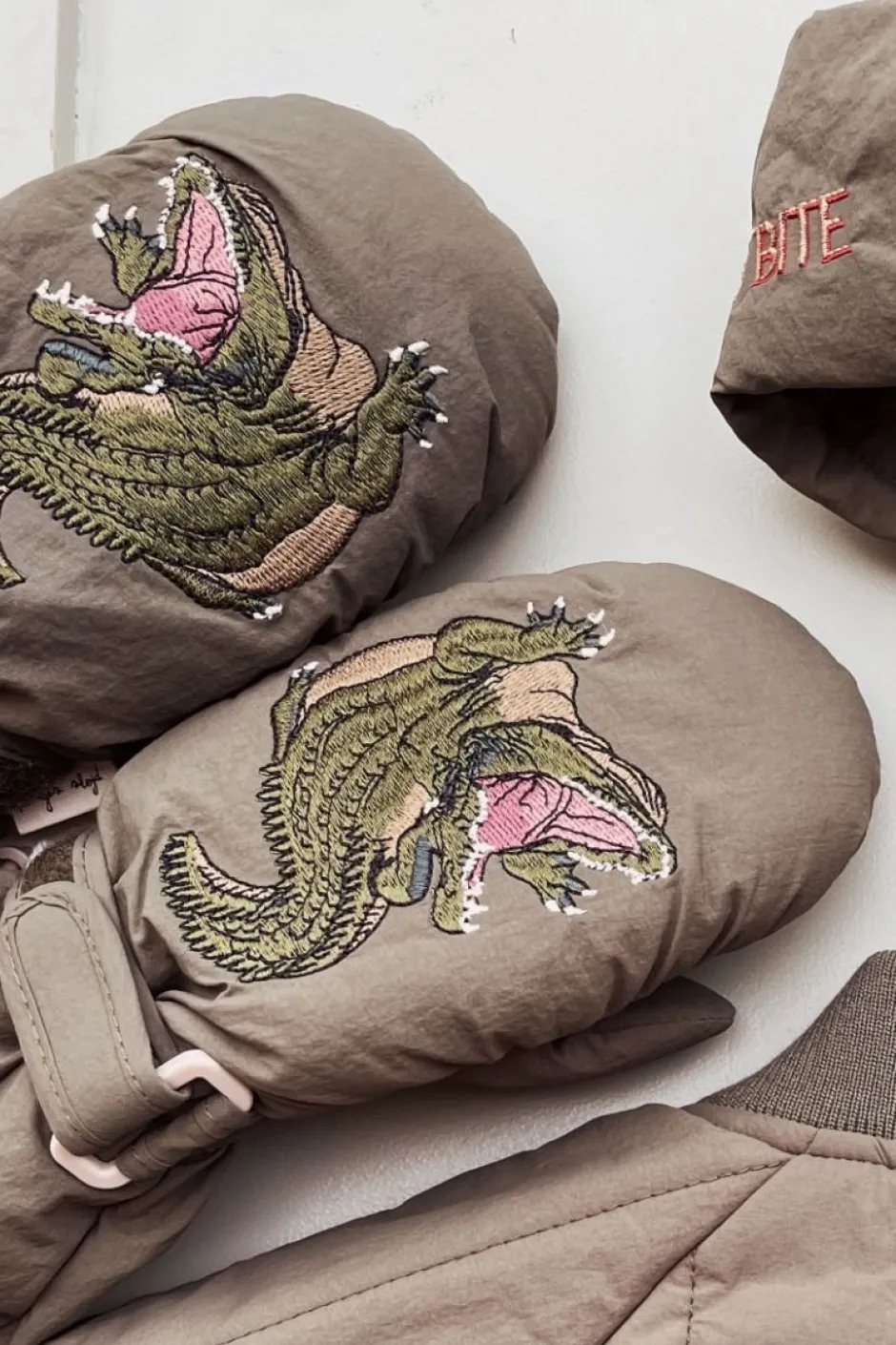 Deze lekkere warme wanten hebben een stoere krokodil op de bovenzijde en zijn erg leuk om te combineren met het bijpassende jasje.
