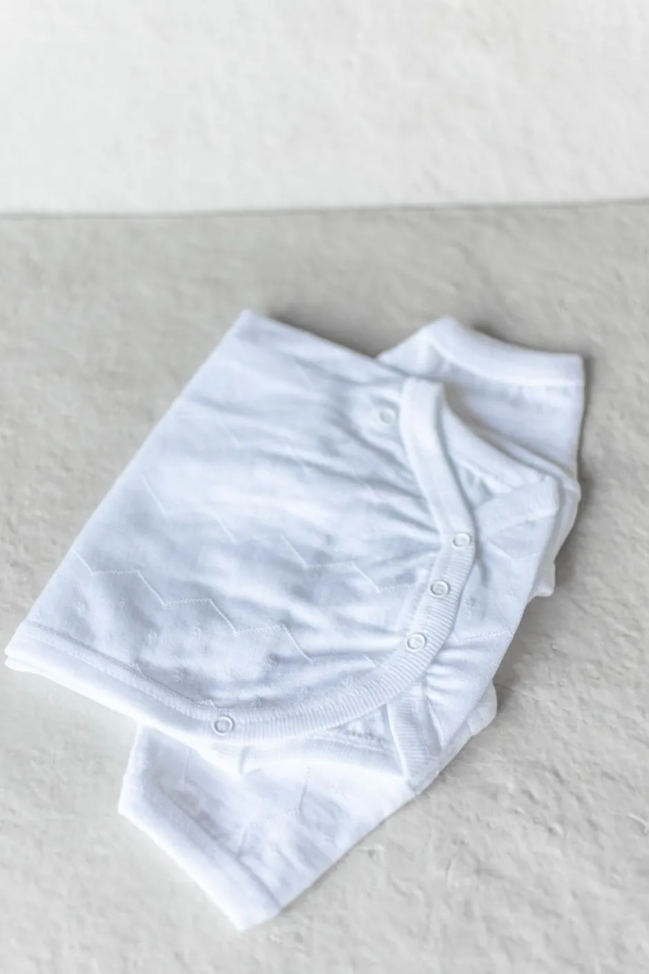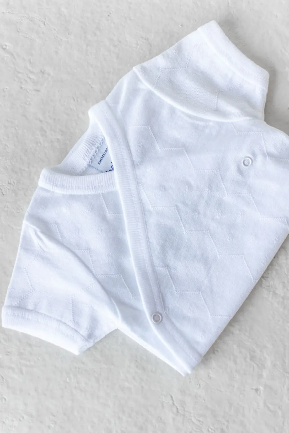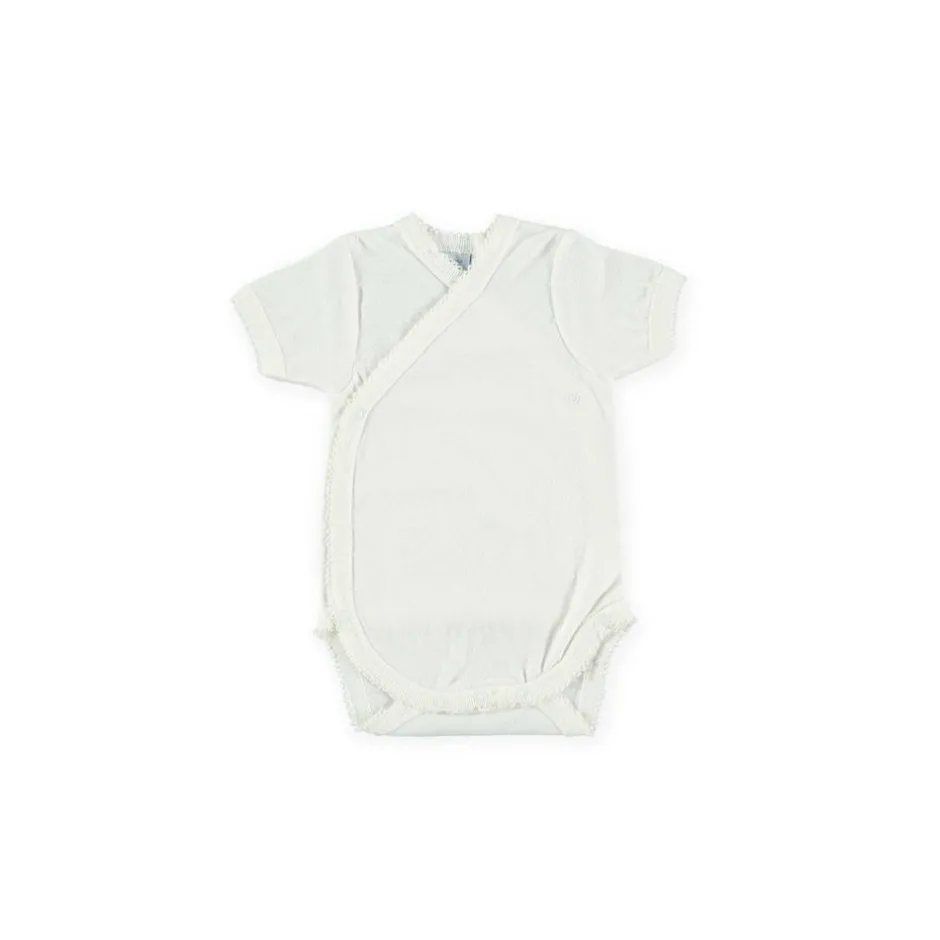 Kort mouwen rompertje met een mooi ‘werkje’ erin. De romper is verkrijgbaar in het wit en off-white.