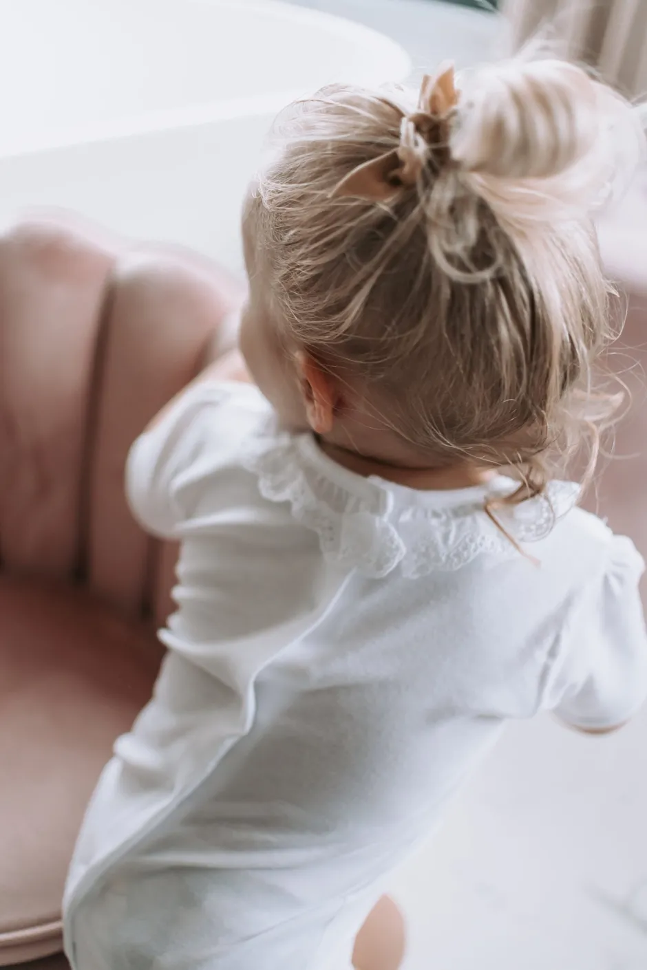 Elli (2 jaar) draagt hier het rompertje 1 maat groter (36 maanden). Het rompertje valt klein.