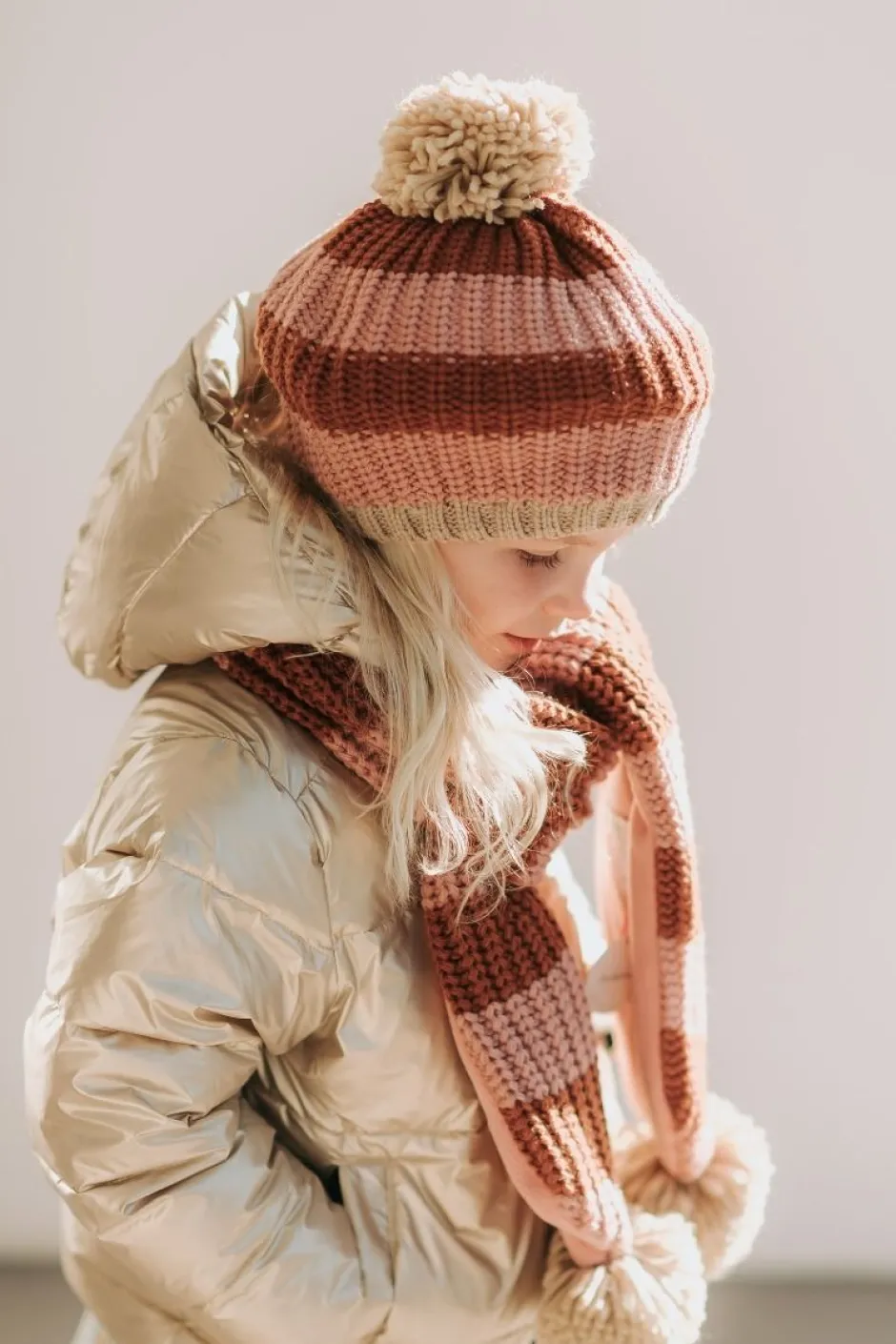 Hoe leuk is deze muts van Rockahula?! De muts heeft lichtroze en roestbruine strepen en een beige pompom, waardoor hij van elke winteroutfit een feestje maakt! Ook leuk om te combineren met de bijpassende sjaal.